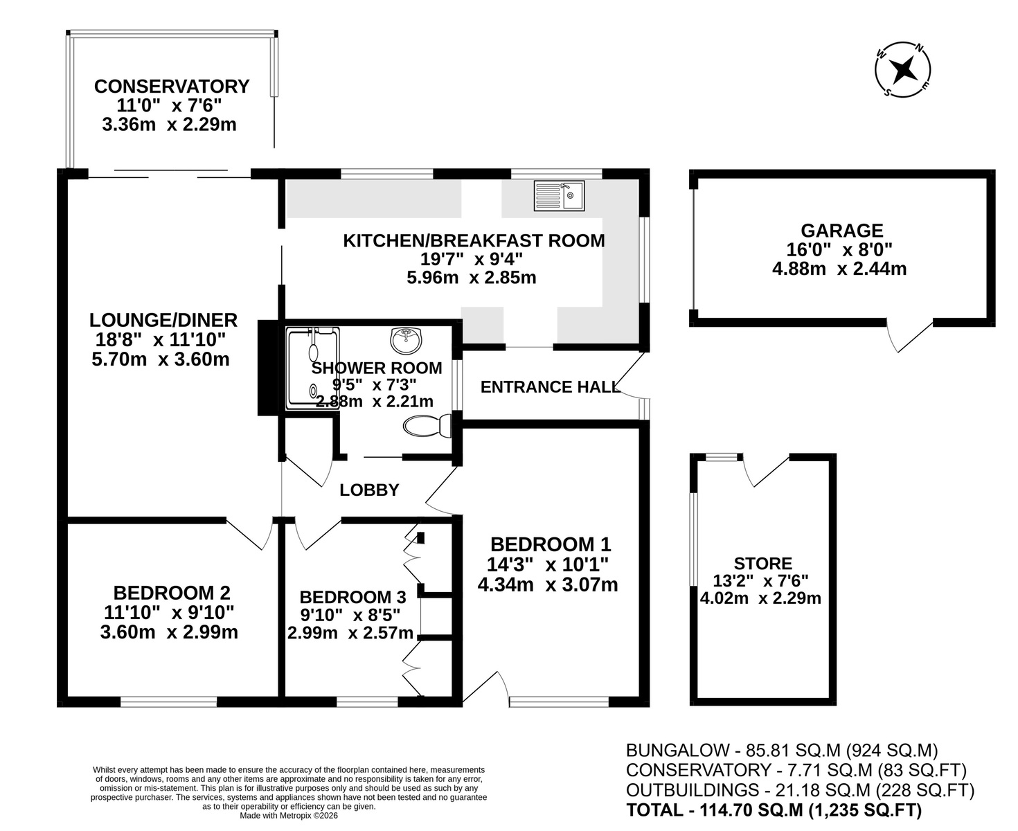 Inside, the property comprises a bright and spacious lounge diner (206.68 sq ft), a fitted kitchen (185.18 sq ft) with ample storage and workspace, three well-proportioned bedrooms (Bedroom 1, 144.43 sq ft; Bedroom 2, 101.01 sq ft; Bedroom 3, 77.35 sq ft), and a family shower room (69.35 sq ft). The bungalow also includes a convenient conservatory (83.60 sq ft). The bungalow provides practical single-level living and offers excellent potential for cosmetic modernisation or further enhancement.
