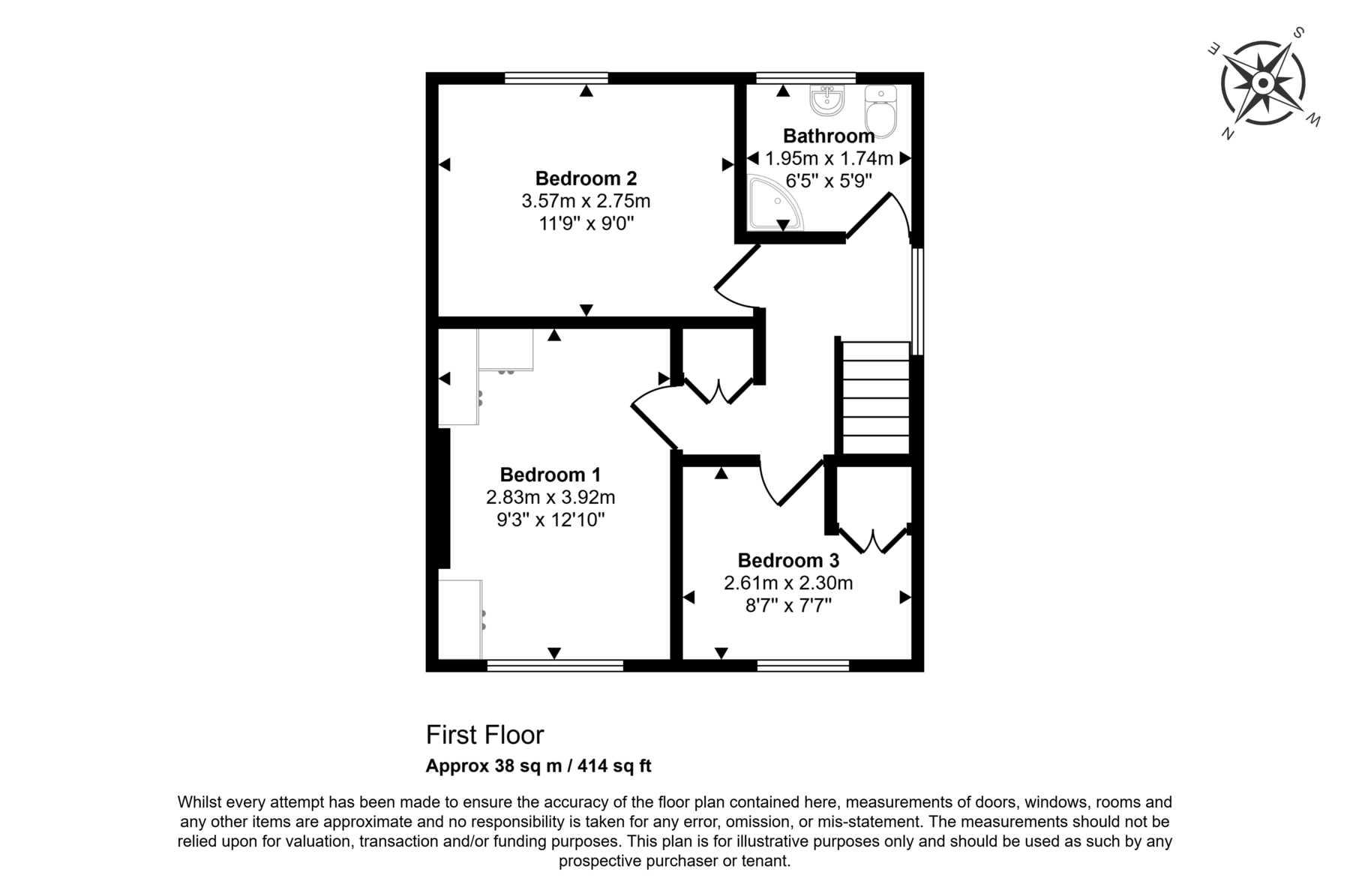 Upstairs (414 sq ft), there are three well-proportioned bedrooms: bedroom one (112.53 sq ft), bedroom two (107.10 sq ft), and bedroom three (66.99 sq ft), along with a generous family bathroom (38.35 sq ft). Large windows throughout flood the home with natural light, creating a bright and comfortable atmosphere.